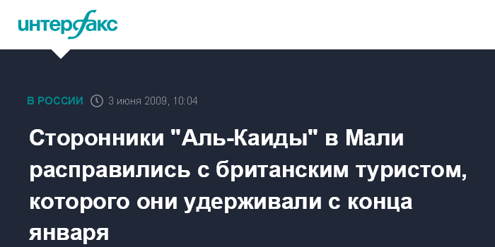 Москва. 3 июня. INTERFAX.RU - Британский турист, удерживавшийся в Мали террористической группировкой "Аль-Каида в Магрибе", убит. С таким заявлением выступил в среду американский центр наблюдения за радикальными исламскими интернет-ресурсами.