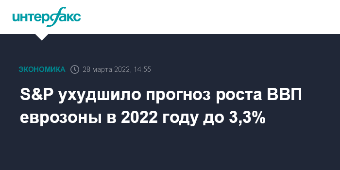 Москва. 28 марта. INTERFAX.RU - Из-за событий на Украине, подстегнувших рост цен на энергоносители, аналитики рейтингового агентства S&P Global Ratings понизили прогноз о росте экономики еврозоны в 2022 году до 3,3% с ранее ожидавшихся 4,4%".
