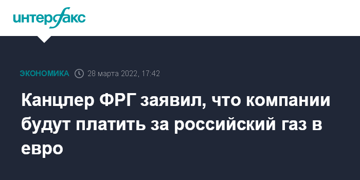 Москва. 28 марта. INTERFAX.RU - Европейские компании заключали контракты о закупках российского газа в евро, так что платить за газ они будут по контрактам, заявил канцлер Германии Олаф Шольц на пресс-конференции с премьер-министром Швеции Магдаленой Андерссон. Его слова приводит Dow Jones.