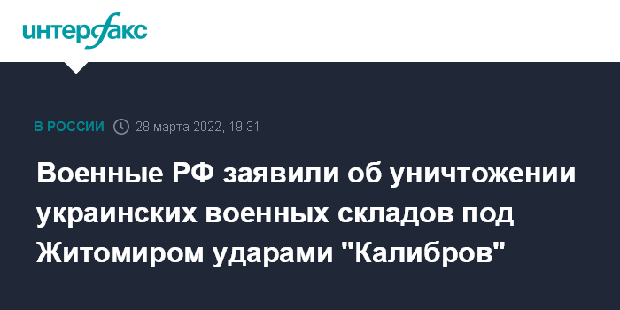 Москва. 28 марта. INTERFAX.RU - Крупные склады с боеприпасами уничтожены ударами ракет "Калибр" в Житомирской области, сообщил официальный представитель Минобороны России Игорь Конашенков на брифинге в понедельник.