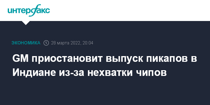 Москва. 28 марта. INTERFAX.RU - Американский автопроизводитель General Motors приостановит выпуск пикапов на своем заводе в городе Форт-Уэйн, штат Индиана из-за дефицита полупроводниковых компонентов с 4 до 18 апреля.