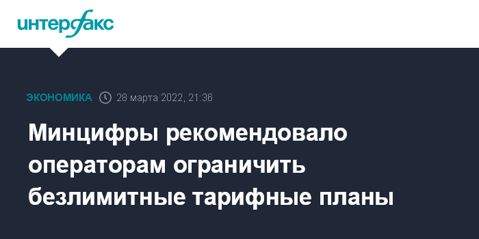 Москва. 28 марта. INTERFAX.RU - Минцифры направило крупнейшим телеком-операторам письмо с рекомендацией исключить неограниченное потребление трафика сотовыми абонентами, в том числе - ограничить безлимитные тарифные планы, говорится в письме (копия послания есть у "Интерфакса").