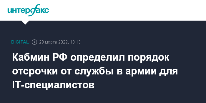 Москва. 29 марта. INTERFAX.RU - Правительство РФ утвердило правила предоставления отсрочки от службы в армии для специалистов отечественных компаний, работающих в области информационных технологий.