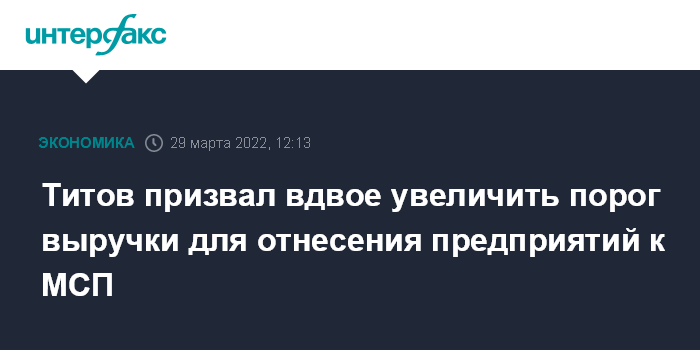 По итогам обсуждения с предпринимательским сообществом Титов предложил правительству поднять пороги выручки для МСП вдвое: для микропредприятий - до 240 млн руб. в год, для малых предприятий - до 1,6 млрд руб., для средних предприятий - до 4 млрд руб. В дальнейшем эти значения должны ежегодно корректироваться в соответствии с фактической инфляцией.