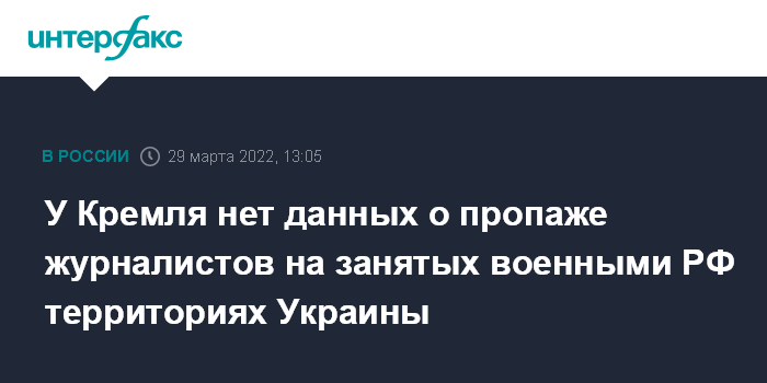 Москва. 29 марта. INTERFAX.RU - В Кремль не поступало обращений о пропаже журналистов или представителей гражданского общества с украинских территорий, находящихся в данный момент под контролем российских Вооруженных сил, заявил пресс-секретарь президента РФ Дмитрий Песков.