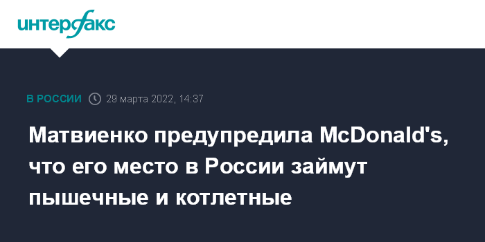 "Уже появилось столько предложений, в частности, в Москве, я знаю, - вместо того же McDonald's" сделать свои котлетные, пышечные, пельменные, кофейни и так далее. Ну, будем питаться более здоровой пищей отечественного производства", - рассказала она журналистам в Казахстане.