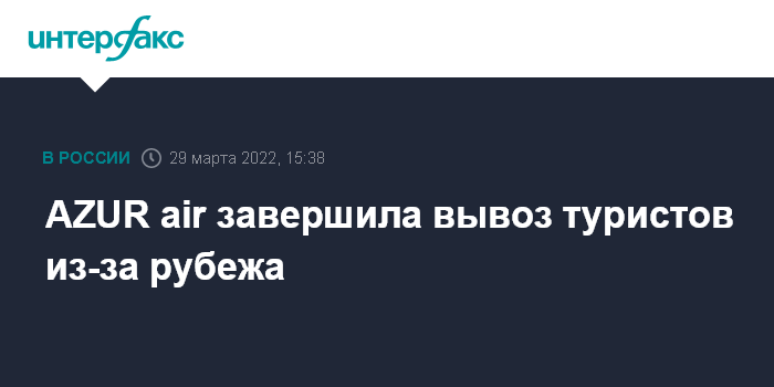 Москва. 29 марта. INTERFAX.RU - Авиакомпания AZUR air завершила вывоз из зарубежных стран туристов, которые не смогли вернуться вовремя из-за отмены рейсов. Всего на родину возвращено более 22 тысяч человек, сообщает пресс-служба авиакомпании.