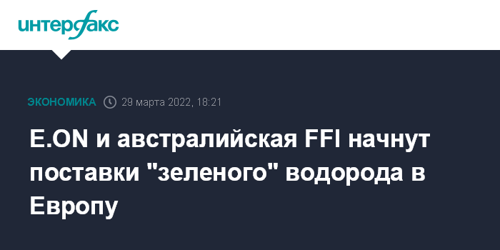 Москва. 29 марта. INTERFAX.RU - Германский энергетический концерн E.ON SE и австралийская Fortescue Future Industries Pty Ltd подписали протокол о намерениях по совместным поставкам "зеленого" водорода в Европу.