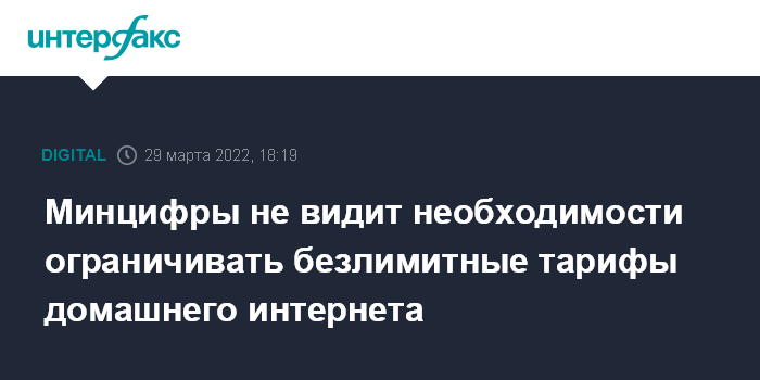 Москва. 29 марта. INTERFAX.RU - Минцифры РФ не считает необходимым ограничение провайдерами безлимитных тарифов домашнего интернета, сообщили "Интерфаксу" в пресс-службе министерства во вторник.