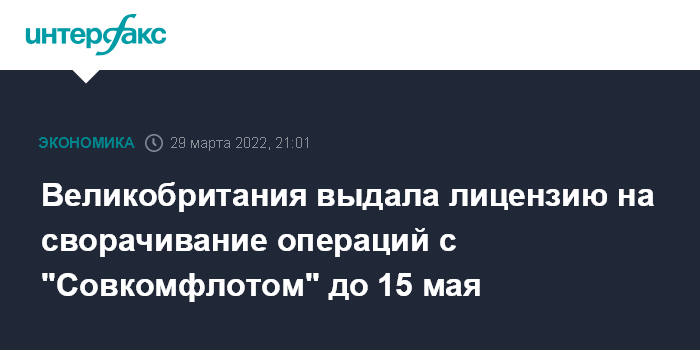 Лицензия действует с 29 марта по 15 мая, сообщил OFSI. Она распространяется на "Совкомфлот" и его дочерние компании.