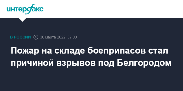 Москва. 30 марта. INTERFAX.RU - Взрывы над Белгородом и Белгородским районом произошли из-за пожара на складе боеприпасов, написал губернатор региона Вячеслав Гладков в своем телеграм-канале в среду.