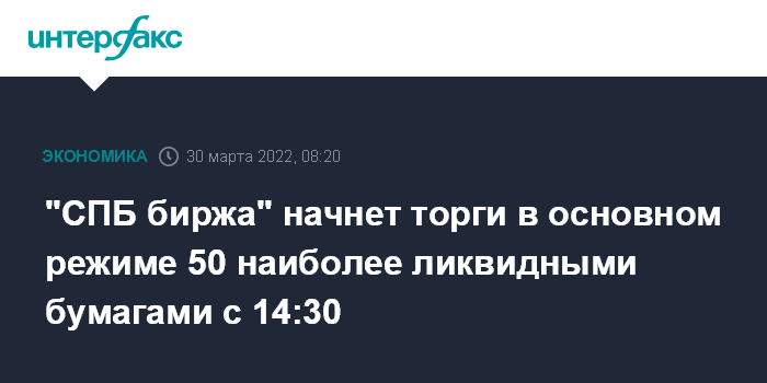 Москва. 30 марта. INTERFAX.RU - "СПБ биржа" сообщила, что 30 марта начнет торги в режиме основных торгов в 14:30 50 наиболее ликвидными бумагами.