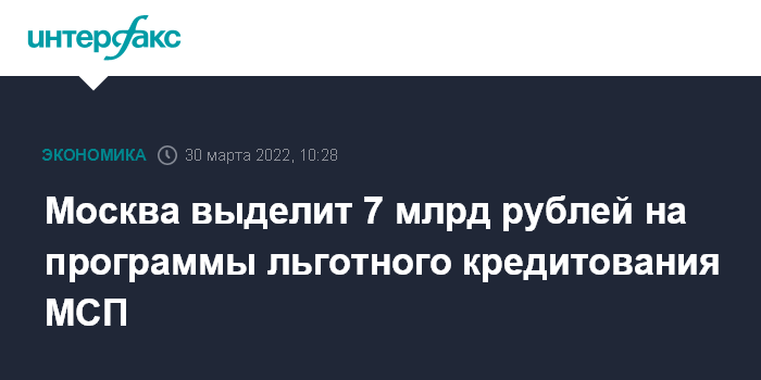 Москва. 30 марта. INTERFAX.RU - Власти Москвы приняли решение о выделении 7 млрд рублей на реализацию ранее утвержденных программ льготного кредитования малого и среднего предпринимательства (МСП). За эти деньги планируется выдать более 8 тысяч кредитов. Об этом сообщили в пресс-службе мэра и правительства столицы в среду.