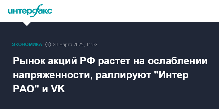 Рынок акций РФ растет на ослаблении напряженности, раллируют "Интер РАО" и VK
