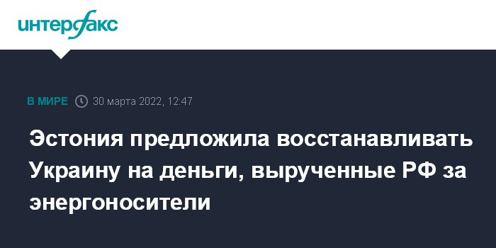 Москва. 30 марта. INTERFAX.RU - Эстония предлагает восстанавливать Украину на деньги от доходов России за нефть и газ, поэтому выплаты ЕС России за поставки энергоносителей, как считаю в Таллине, следует временно задепонировать.