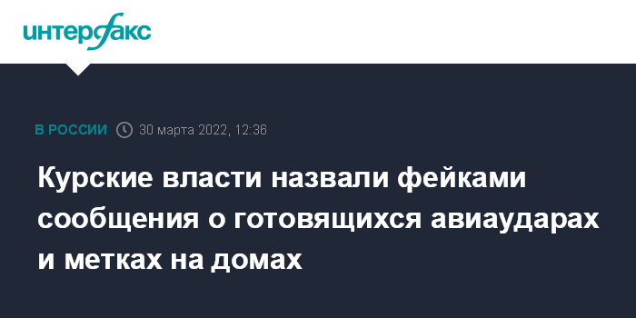 Москва. 30 марта. INTERFAX.RU - Администрация Курской области призывает жителей не верить информации, размещаемой в фейковых аккаунтах соцсетей о якобы готовящихся взрывах и авиаударах в регионе.