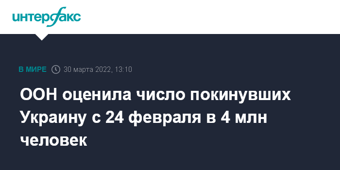Москва. 30 марта. INTERFAX.RU - С момента начала спецоперации РФ в феврале Украину покинули более 4 млн человек, сообщает во вторник Управление Верховного комиссара ООН по делам беженцев (УВКБ ООН).