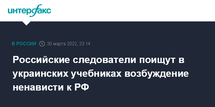 Москва. 30 марта. INTERFAX.RU - Российским следователям "в рамках расследования уголовных дел о событиях на Донбассе" предстоит проверить украинские школьные учебники на предмет возбуждения ненависти к России и русскому языку, сообщает в среду телеграм-канал Следственного комитета РФ (СКР).