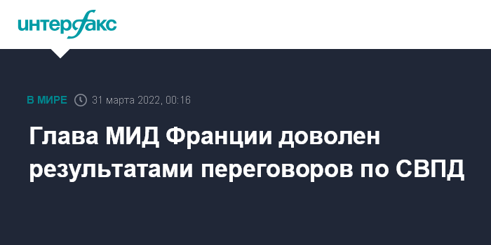 Москва. 31 марта. INTERFAX.RU - Министр иностранных дел Франции Жан-Ив Ле Дриан считает прорывом в переговорах в Вене по возобновлению Совместного всеобъемлющего плана действий (СВПД) по иранской ядерной программе то, что стороны пришли к основе соглашения.