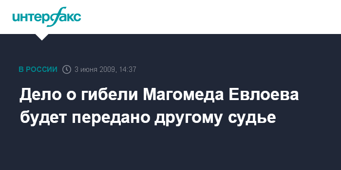 Москва. 3 июня. INTERFAX.RU - Судья Назрановского суда Ингушетии, рассматривающий дело о гибели владельца сайта "Ингушетия.ру" Магомеда Евлоева, принял отвод, на котором настаивали родственники погибшего. Об этом сообщил представитель семьи Евлоева Муса Плиев.