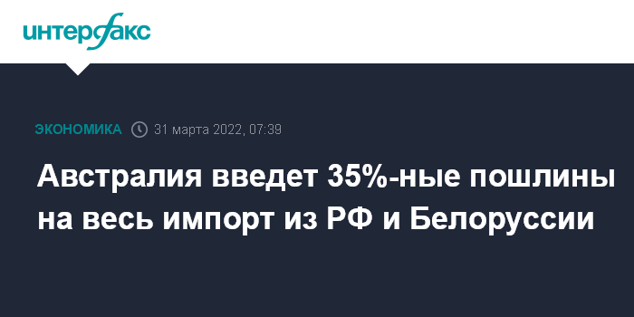 Москва. 31 марта. INTERFAX.RU - Правительство Австралии вводит дополнительные пошлины в размере 35% на все товары, импортируемые из России и Белоруссии.