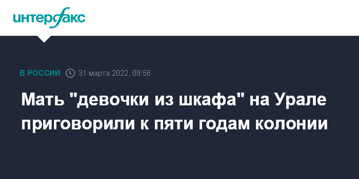 Москва. 31 марта. INTERFAX.RU - Суд в Карпинске (Свердловская область) вынес обвинительный приговор местной жительнице, которая запирала дочь после рождения в шкафу, сообщает пресс-служба областной прокуратуры.