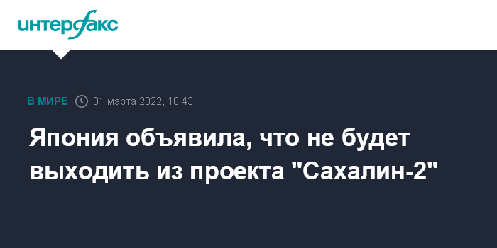 Москва. 31 марта. INTERFAX.RU - Япония не станет выходить из российского нефтегазового проекта "Сахалин-2", сказал премьер-министр страны Фумио Кисида в ходе выступления в парламенте.