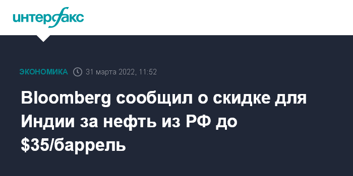 По их данным, Россия предлагает Индии свой флагманский сорт нефти Urals со скидкой до $35 за баррель по сравнению с ценами до 24 февраля (с тех пор Brent подорожала примерно на $10).