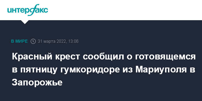 Москва. 31 марта. INTERFAX.RU - Международный комитет Красного Креста (МККК) готовится организовать 1 апреля гуманитарный коридор из Мариуполя в Запорожье, сообщает пресс-служба МККК в четверг.