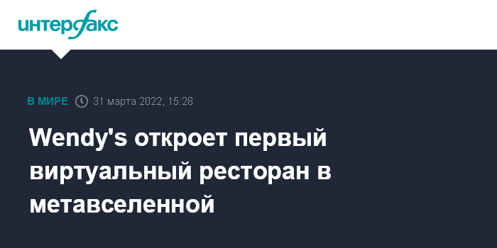 Москва. 31 марта. INTERFAX.RU - Wendy's Co, третья по величине сеть ресторанов быстрого питания в США, откроет первый виртуальный ресторан в метавселенной, разрабатываемой компанией Meta Platforms Inc. (признана в РФ экстремистской организацией и запрещена).