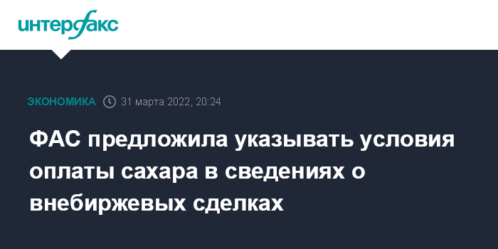 Москва. 31 марта. INTERFAX.RU - ФАС предлагает дополнить сведения, предоставляемые бирже о внебиржевых договорах поставки сахара, данными об условиях его оплаты. Это необходимо для формирования корректного ценового индекса на сахарном рынке, следует из пояснительной записки к соответствующему проекту постановления правительства, размещенному на сайте regulation.gov.ru.