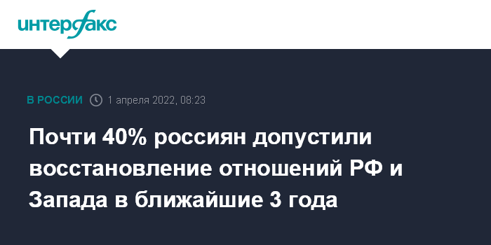 Москва. 1 апреля. INTERFAX.RU - Более трети россиян (38%) уверены, что экономические, культурные и спортивные связи России и Запада восстановятся в течение ближайших трех лет, свидетельствуют данные Фонда "Общественное мнение" (ФОМ), поступившие в "Интерфакс".