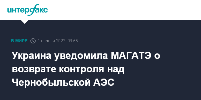 Москва. 1 апреля. INTERFAX.RU - Украина сообщила МАГАТЭ о возврате контроля над Чернобыльской АЭС, говорится в заявлении на сайте агентства.