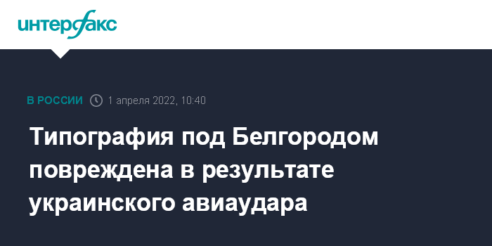 Москва. 1 апреля. INTERFAX.RU - Здание типографии под Белгородом получило повреждения в результате авиаудара украинских вертолетов, сообщила "Интерфаксу" коммерческий директор типографии "Константа" Юлия Богатырева.