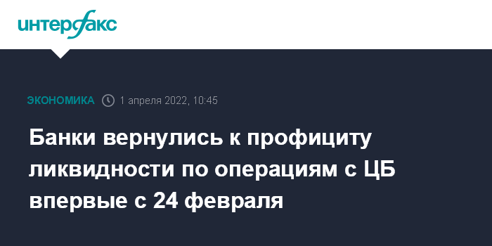 До этого пять недель после 24 февраля, когда профицит ликвидности составлял 113,1 млрд рублей, фиксировался дефицит ликвидности.