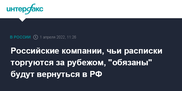 Москва. 1 апреля. INTERFAX.RU - Российские компании, чьи депозитарные расписки торгуются за рубежом, "обязаны" будут вернуться в Россию, если правительство не примет иного решения, сообщил на брифинге министр экономического развития Максим Решетников.