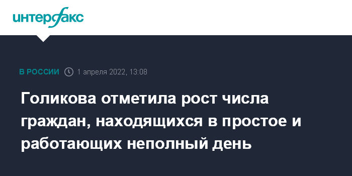 Москва. 1 апреля. INTERFAX.RU - Ситуация на рынке труда в России остается стабильной, при этом фиксируется рост количества граждан, работающих в режиме неполного рабочего дня или недели, а также находящихся в простое, сообщила вице-премьер Татьяна Голикова на заседании межведомственной рабочей группы по восстановлению рынка труда.
