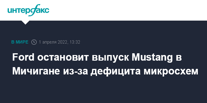Москва. 1 апреля. INTERFAX.RU - Американский автоконцерн Ford Motor Co. с 4 апреля на неделю приостановит производство на заводе в Мичигане, где собираются спортивные автомобили Mustang, из-за сохраняющегося дефицита микросхем.
