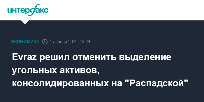 Москва. 1 апреля. INTERFAX.RU - Evraz принял решение отменить выделение угольных активов, консолидированных на "Распадской".