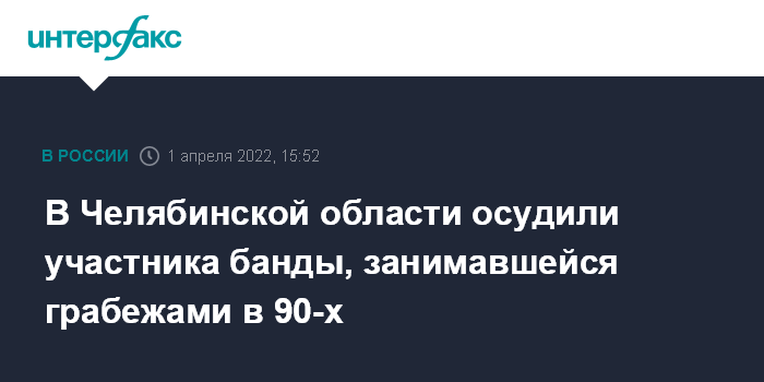 Москва. 1 апреля. INTERFAX.RU - Челябинский областной суд вынес приговор участнику банды, занимавшейся вооруженными грабежами в 1996-1997 годах, сообщает пресс-служба областной прокуратуры в пятницу.