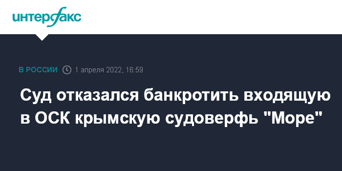 Москва. 1 апреля. INTERFAX.RU - Арбитражный суд Крыма отказался признать АО "Судостроительный завод "Море" (Феодосия, Крым, входит в ОСК) несостоятельным (банкротом), заявление ООО "Металлинвест" (Свердловская область) оставлено без рассмотрения, говорится в материалах суда.