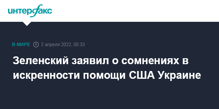 Москва. 2 апреля. INTERFAX.RU - Украинский президент Владимир Зеленский в интервью американскому телеканалу Fox News заявил, что отказ США от поставок военных самолетов и ракет может вызвать сомнение в действительной готовности США оказывать помощь Украине.
