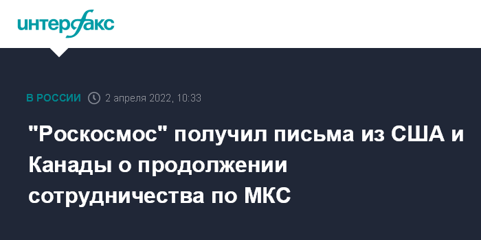 "Я могу заверить Вас, что Канада продолжает поддерживать программу МКС и привержена ее безопасной и успешной эксплуатации. Хотя Канадское космическое агентство не имеет прямого сотрудничества с АО "ЦНИИмаш" и АО "РКЦ "Прогресс", мы продолжим работать с соответствующими правительственными организациями Канады, чтобы способствовать дальнейшему сотрудничеству и эксплуатации МКС", - говорится в письме главы Канадского космического агентства.