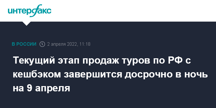Текущий этап продаж туров по РФ с кешбэком завершится досрочно в ночь на 9 апреля