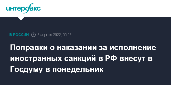 Поправки о наказании за исполнение иностранных санкций в РФ внесут в Госдуму в понедельник