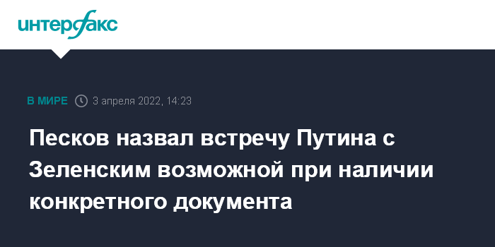 Москва. 3 апреля. INTERFAX.RU - Президент России Владимир Путин никогда не отказывался от встречи с президентом Украины Владимиром Зеленским, но ее черед настанет, когда будет подготовлен конкретный письменный документ, заявил в воскресенье пресс-секретарь главы государства Дмитрий Песков.