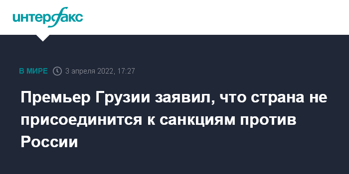 Москва. 3 апреля. INTERFAX.RU - Грузия не присоединится к экономическим санкциям против России, исходя из интересов страны и народа, заявил глава грузинского правительства Ираклий Гарибашвили.
