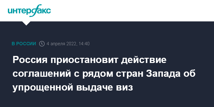 В частности, приостанавливается ряд пунктов соглашений между РФ и европейским сообществом об упрощении выдачи виз гражданам РФ и Евросоюза, аналогичных соглашений между Россией и Норвегией, Россией и Данией, Россией и Исландией, Россией и Швейцарией, а также между РФ и Княжеством Лихтенштейн.