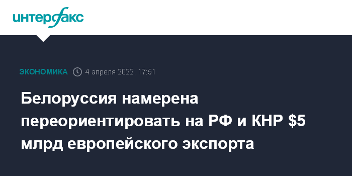 "Развернута активная работа госорганов, отраслей и бизнеса по переориентации экспортных поставок на рынки дружественных государств. Разумеется, наиболее перспективные для нас - Россия и Китай. Суммарно в эти страны в краткосрочной перспективе может быть перенаправлено более $5 млрд европейского экспорта. В том числе в полном объеме - продовольствие, продукция машиностроения и легкой промышленности", - сказал Ярошевич, которого цитирует пресс-служба Минэкономики.