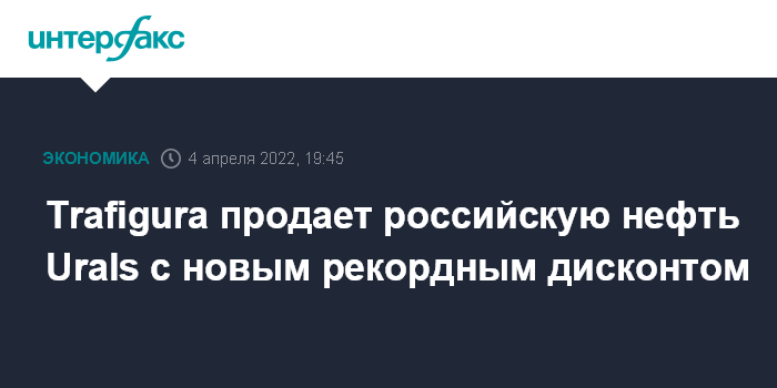 Москва. 4 апреля. INTERFAX.RU - Международный трейдер Trafigura предлагает нефть марки Urals с поставкой 20-24 апреля с дисконтом в минус $34,8 к бенчмарку Dated Brent, сообщает агентство Bloomberg.